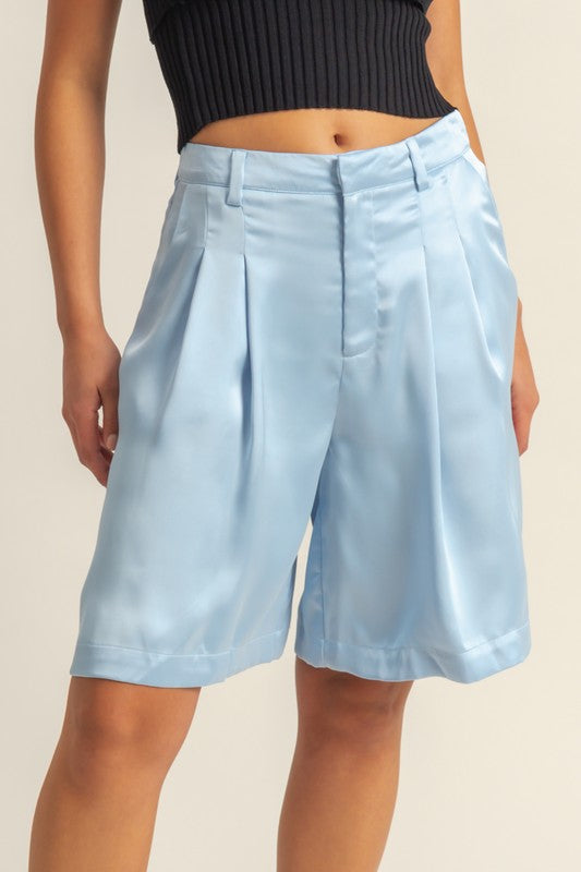 The High-Waist Pleated Satin Shorts are a luxurious and chic addition to your wardrobe. Featuring a high waist design that accentuates the waistline, these shorts offer a flattering silhouette. The pleated satin fabric adds an elegant and sophisticated touch to the ensemble. These shorts are perfect for dressing up for a special occasion or adding a touch of glamour to a casual outfit. Pair them with a blouse or a crop top for a stylish and on-trend look that is sure to turn heads.