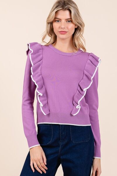 Mittoshop Contrast Trim Ruffled Round Neck Knit Top