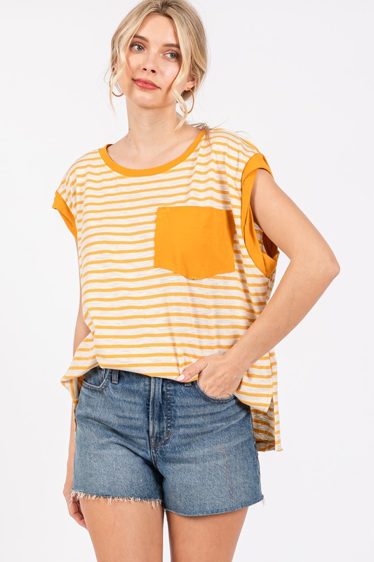 The Side Slit Striped Cap Sleeve T-Shirt is a casual and trendy garment that offers both style and comfort. With a striped pattern, cap sleeves, and side slits, this t-shirt combines classic elements with modern details. The side slits provide a unique touch and add a bit of flair to the traditional t-shirt design. Perfect for everyday wear, this t-shirt can be paired with jeans or shorts for a relaxed yet fashionable look. Stay on-trend with this stylish and versatile piece that is perfect for a casual day out.