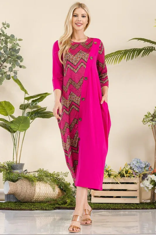 Celeste Full Size Geo Print Paneled Dress with Buttons Plus Size