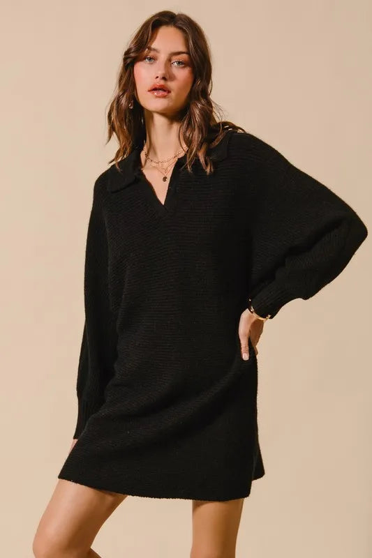 The loose fit ribbed knit sweater collar neck dress is a cozy and stylish option for chilly days. The ribbed knit fabric provides texture and warmth, while the loose fit offers a comfortable and relaxed silhouette. The sweater collar neck adds a touch of sophistication to the dress. Perfect for pairing with boots or sneakers for a casual yet chic ensemble. Stay warm and fashionable with this versatile and on-trend sweater dress.